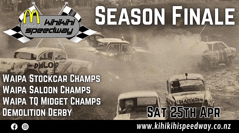 Subject to change without notice. All persons attending McDonald's Kihikihi Speedway do so entirely at their own risk. It is a condition of admission that all persons having any connection with the promotion and/or organisation and/or conduct of a meeting; including owners and leasees of the stadium and the owners and drivers of the vehicles and passengers in the vehicles are absolved from all liability arising out of accident causing damage or personal injury to spectators or ticket-holders.